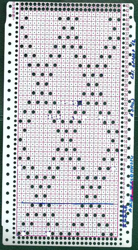 ponset выкладываю перфокарту, первый ряд вяжется ажурной кареткой, а далее поочередно по 2 ряда. (просто я не стала стрелочки рисовать)