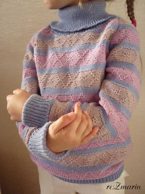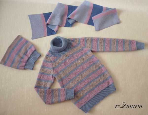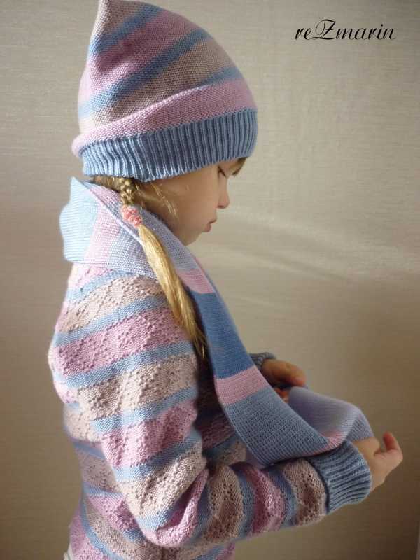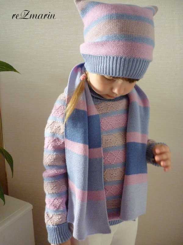 Комплектик для дочурки....на скорую руку, оказалось , что мы за лето сильно выросли - и все кофточки стали короткими, а холод наступил жудкий - так появился простенький свитерочек из п.ш. в 4 нити из остатков пряжи, а к нему и шапка с шарфом.
