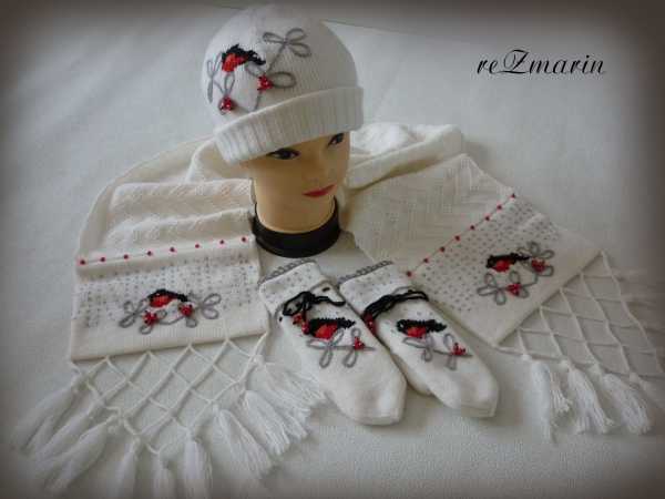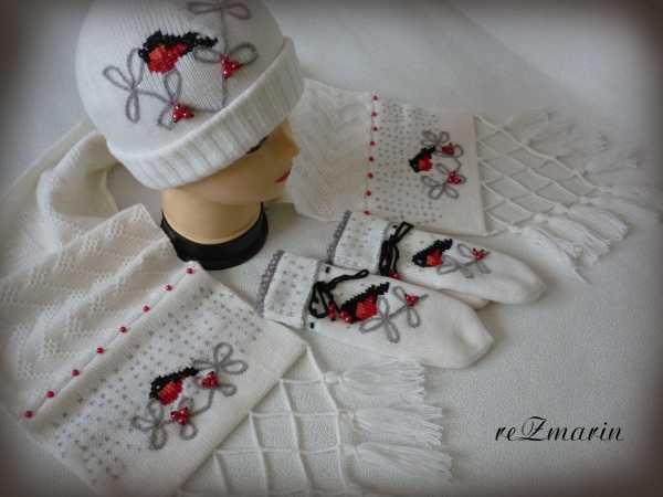 Комплект "Снегири" в белом цвете. Пряжа аэлита в 2 нити. Шапка и варежки двойные.