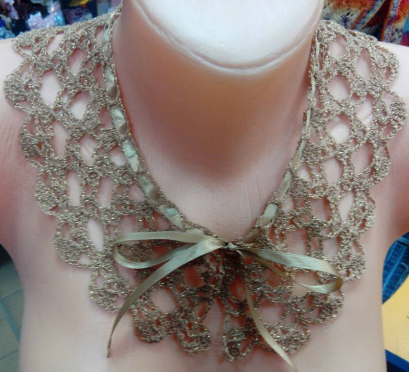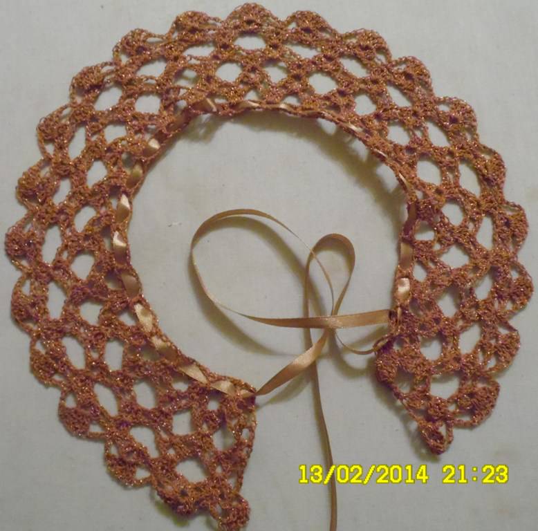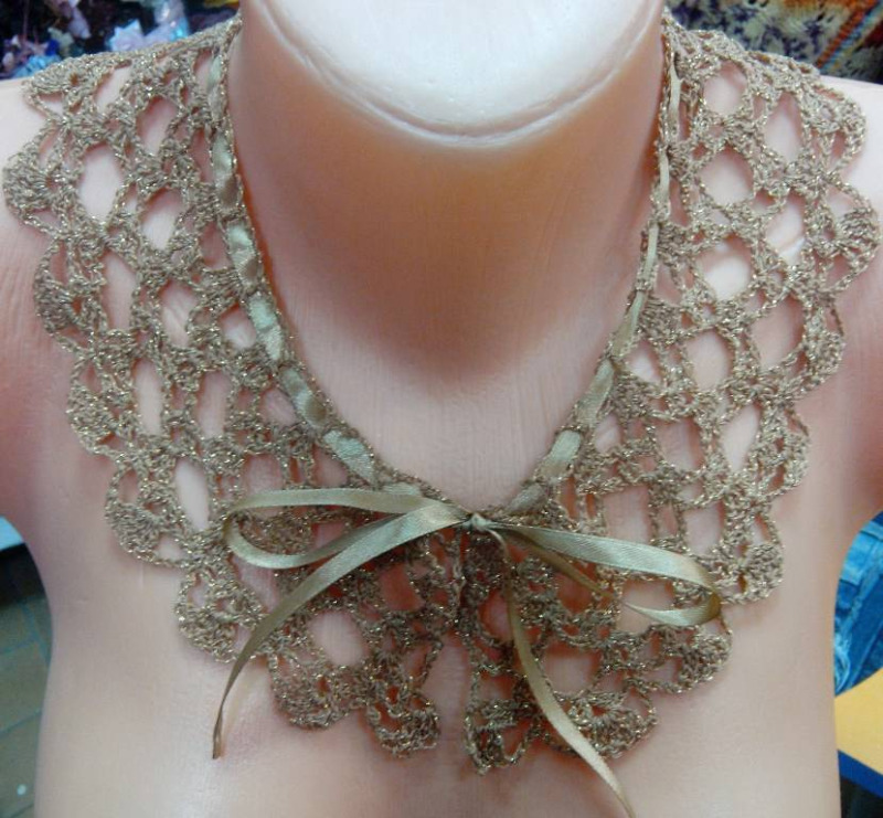 А это ажурный воротничек, связан крючком из "Золотой шар" 86% хлопок 14% люрекс, К-т им. Кирова, ушло наверное гр15-20. на последней фотке цвет более реальный