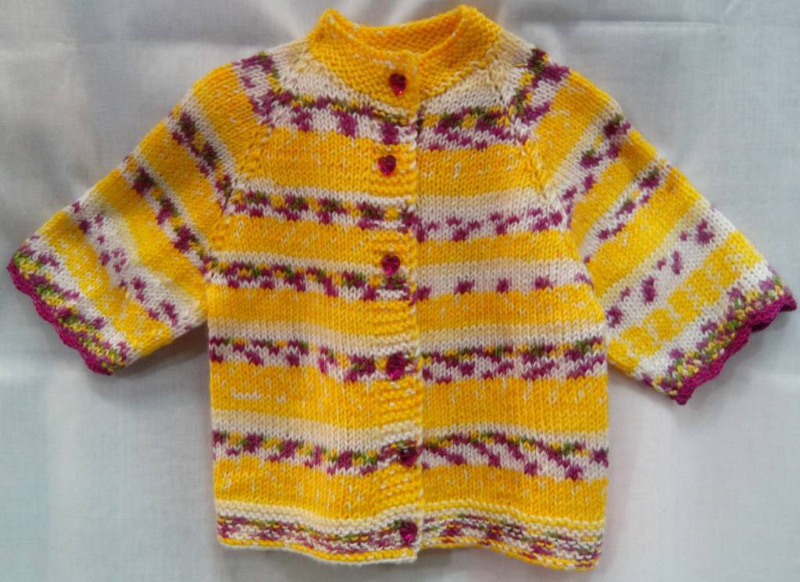 Это детская кофточка связана спицами из пряжи BAMBINO MATIK. Рисунок ложится сам, кофточка связана сверху вниз без швов из 1 моточка и 6 пуговичек.