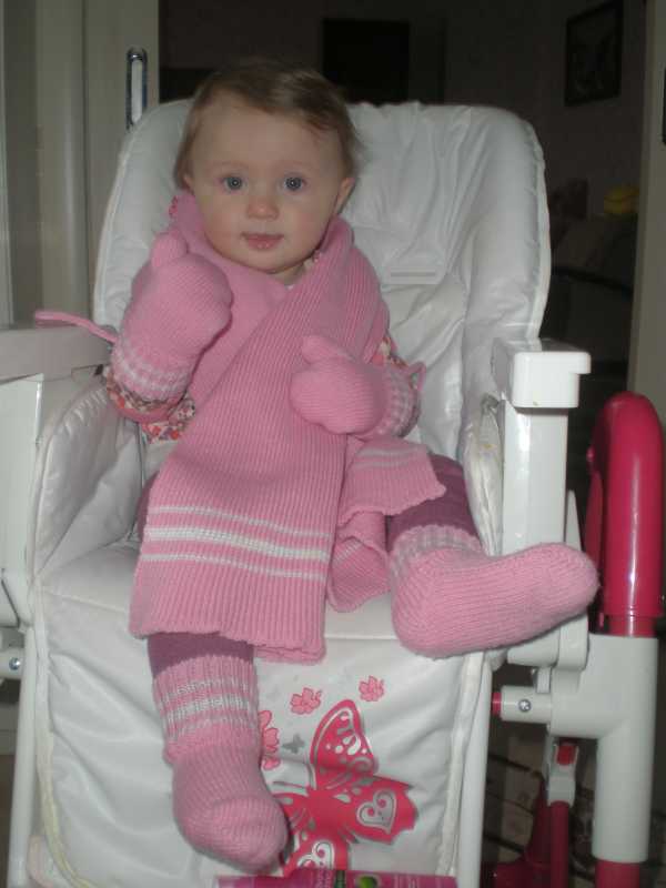 Маша, такая лапа :ugu: засмотрелась, так что вязалочки рассматривала во вторую очередь :) Видно, что малышке нравится, цвет чисто девчачий. Все такое нежное, класс!!! Какого же там размера варежулечки???