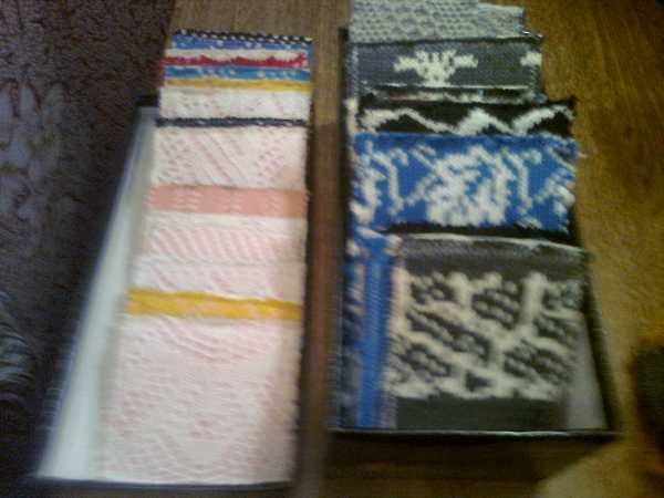 вот так я храню свои оброзцы,после того как связанно изделие -оброзец подшиваю на картон и с обратной стороны пишу номер перфокарты,заказчику очень удобно определятся с узором