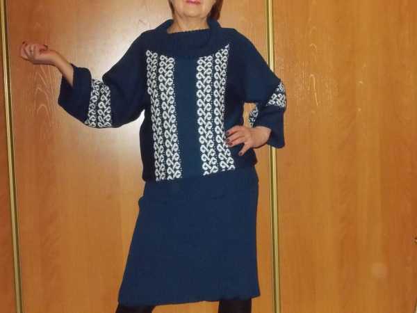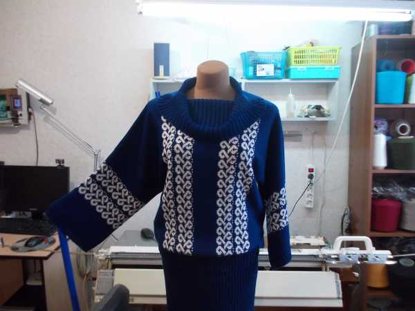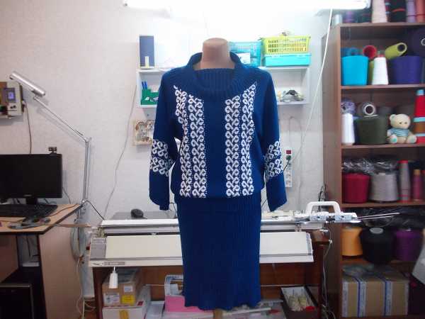 Девочки спасибо за оценочку моей работы. Очень приятно читать ваши отзывы. :flover2: :flover2: :flover2: Теперь отвечаю на вопросики. По узору, на синем костюмчике узор загружала в машину из ДК8, это из 5 каталога, а на свитерке двухфонтурный жаккард из машины № узора 33. Воротник вяжется очень просто, резинка 2х2через 1, 80 рядов, меняла плотность , сначала больше брала, к горловине убавляла, кеттлевала на машине. А это костюмчик на хозяйке. Кофточка связана поперечным вязанием.