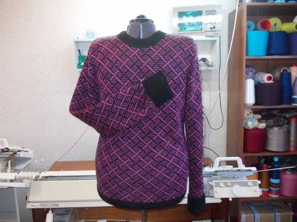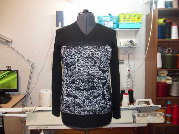 Девочки спасибо большое за похвальные отзывы. Очень приятно их читать. :flover2: :flover2: Связались два изделия Свитерок для младшего внука, сфотографирован на женском маникене. Двухфонтурный жаккард: в три ниточки б/п, рукава кулирная гладь. И еще связался джемперок для девушки, двухфонтурный жаккард, узор на любо дело, скачала. Долго я изучала, как в ДК 8 , разместить его на выкройке, сделать правильные настройки палитры, способа вязки, плотности, как правильно загрузить интегрированный узор в машину. И вот результат, леопардик связался.