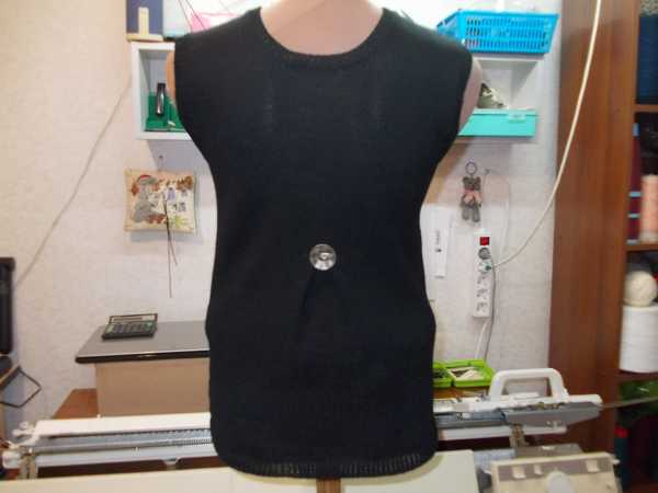 Желеточка из пряжи Элегант черного цвета с карманами и складочкой на спинке. Это спинка