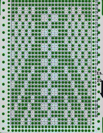 Ира у меня вопросик по юбке-по перфокарте видно, что между мотивами- небольшое расстояние без рисунка- ты на этих рядах отключаешь жаккард или вынимаешь нитку(для рисунка)?