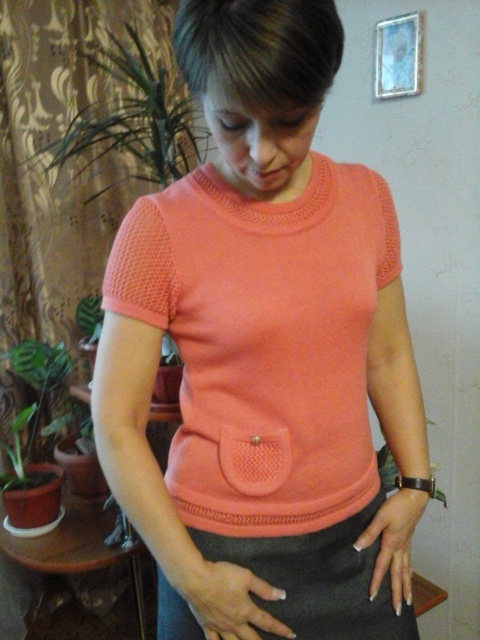 Какая радостная кофточка.Отделка низа и горловины очень украшает, а кармашек привлекает глаз.