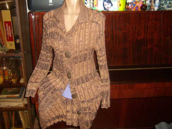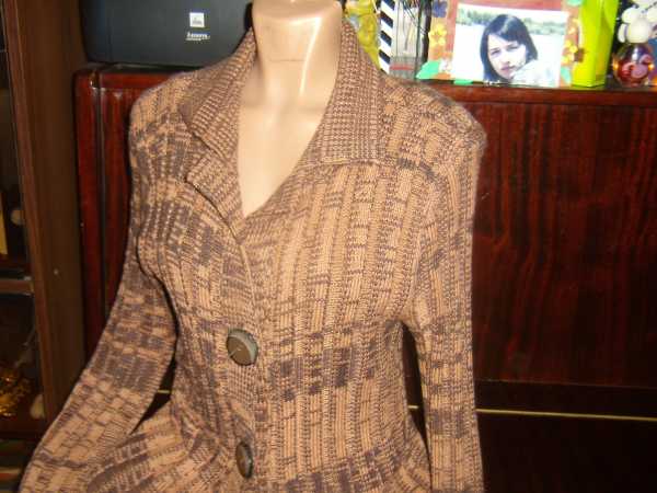 сфоткала кардиган . пряжа " олимпия" п/ш 100гр - 400м. В 2 нити светло коричнев. и т.коричнев. Ношу сама уж больше 5ти лет.., осень - весну практически не снимая.. и в пир и в мир...