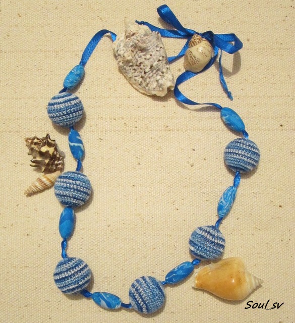 Вчера закончила вот такие бусы. Мечтаю к ним платье для дочери связать в сине -белую полоску, чтобы морской стиль получился. Сейчас в голове еще промелькнула мысль, а сумочку ведь тоже нужно будет связать :wink: Напланировала))) самой аж смешно стало. Бусы вязала, т.к. остались можжевеловые бракованные бусины + слепила из пластики бусины, собрала все на атласную ленту. Еще учусь красиво сфотографировать, правда не всегда получается.