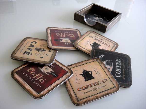 Материал: квадратики и коробочка из необработанной фанеры, декупажная карта, клей-лак для декупажа, коричневая акриловая краска, грунт акриловый, кисточка, губка, матовый лак, наждачная бумага и очумелые ручки :oops: .
