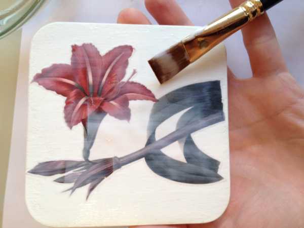 прикладываем на заготовку и сверху наносим клей-лак для декупажа