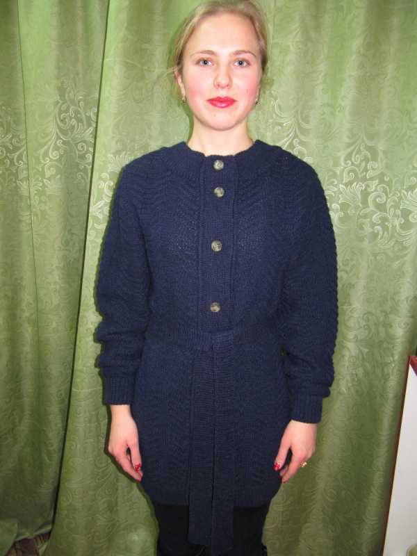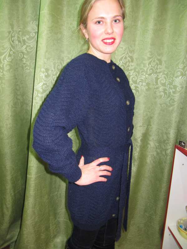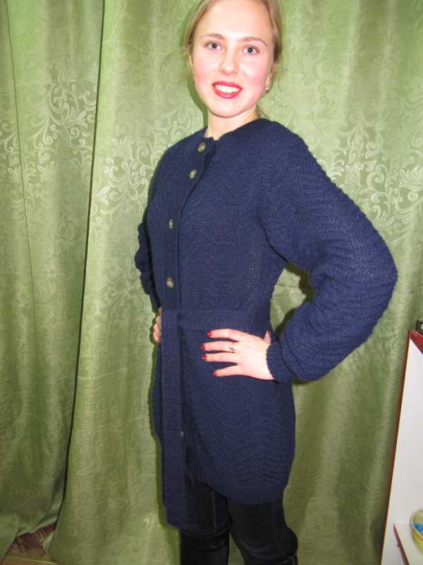 Вот мой первый в жизни кардиган. Чесно...Связан роботом-кареткой.Уж очень узор понравился. Спасибо огромное за помощь моих друзей, Леночке-модератору за обьяснение выкройки и расчётов, Светику Францевне и Валере-Вязальщику. Без вас я бы не справилась. Особую благодарность Анечке-администратору за создание такого замечательного сайта, дающего совершенствовать своё умение таким новичкам, как я.