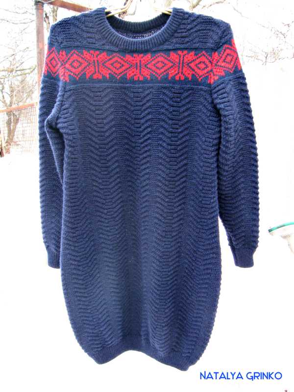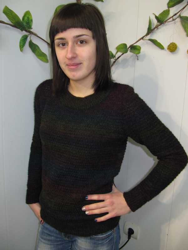 Наконец связала дочери первый свитер. Главное, что ей понравился. Теперь просит к свитеру юбку, чтоб костюм был. Вязала из итальянского мохера в один конец+ нить полиестера для крепости, плотность 5. Узор- пресс с удвоением ряда.