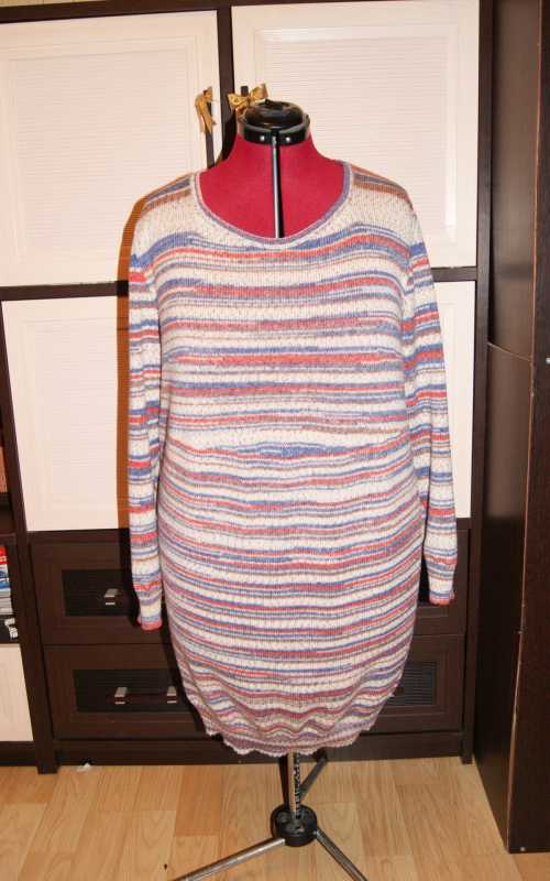 А по технологии... Все просто- кулирная гладь, всегда делаю выточки на груди. По скольку нить толстая то плотность 10, по этой причине воротник не кетлеванный, а одевала на иглы, далее ластик 2*2, но чтоб край лег по шее каждую 3 петлю закрывала вместе с четвертой. Вот расход не поняла :drims: , мама на купила ниток, а я их туда-сюда мотала.