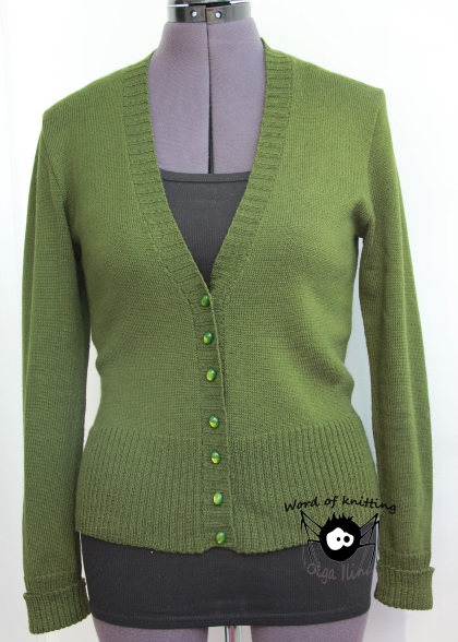 Вот связала кофточку, пряжа "Семеновская" Лидия в 2 сложения. Цвет исказил фотоаппарат, и пуговки отсвет дали от фотовспышки. На самом деле цвет болотно-зеленый.
