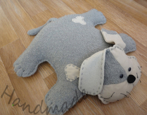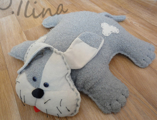 Из остатков буклированной пряжи+флис. Связала полотном потом раскроила. Получилась вот такая собачка-подушка.