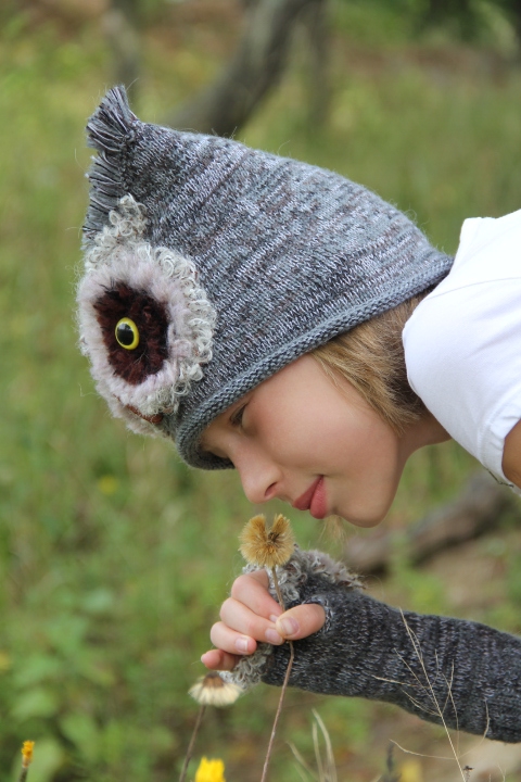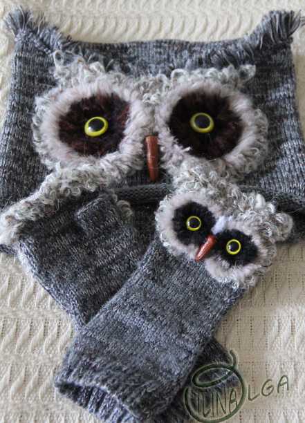 Комплект: Шапочка+митенки "СОВЫ". Так как у меня дочка любит сов, связала ей вот такой комплект.