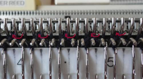 Провязывает 2 ряда. Затем в обратном порядке перевешиваем петли
