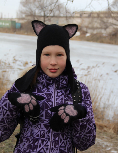 А пока вот такой комплект сваляла. Шапочка + варежки. Варежки делала сама, первый раз. Результатом довольна. Шапочка тонкая,мягкая, делала на мастер классе в студии SW. Очень сложно переходить с толстого войлока на тонкий.