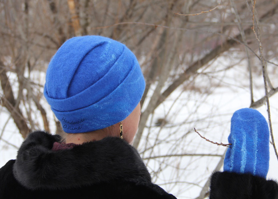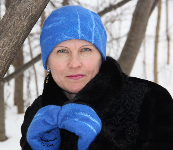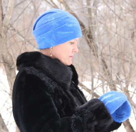 А это я себе сделала подарок . Шапочка + варежки, сваляны из шерсти.