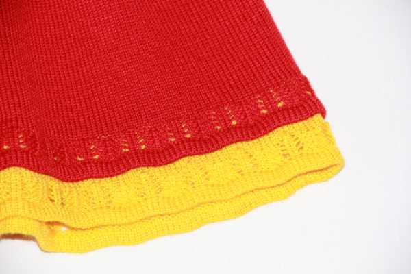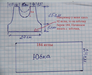 Танюш, извини выкройка от руки, я все сама считаю. Рассчитываешь полочку и спинку по своей плотности. А Юбочка прямоугольник. Начинаем с юбочки вязать, сбрасываем на дополнительную нить, затем навешиваем на игольницу по 2 петли и вяжем полочку. То же самое со спинкой.