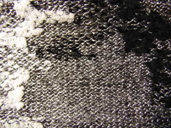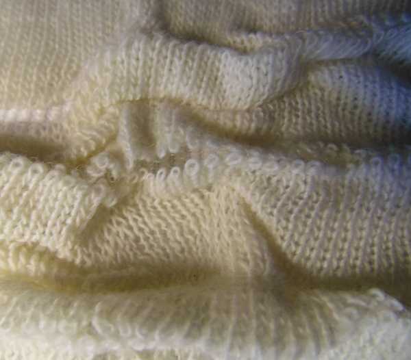 На спинке сзади хорошо видна линия перегиба,залоснившаяся от носки- это даёт представление, что перегнут кусок трикотажа( единственно начинать и заканчивать эток кусок на 200 игл по обеим фонтурам нужно с бросовой нити, для того, чтобы потом при сборке первый и последний ряды спинки и переда закрывать одинаково- вручную и иглой) Рукава- обычно, снизу.