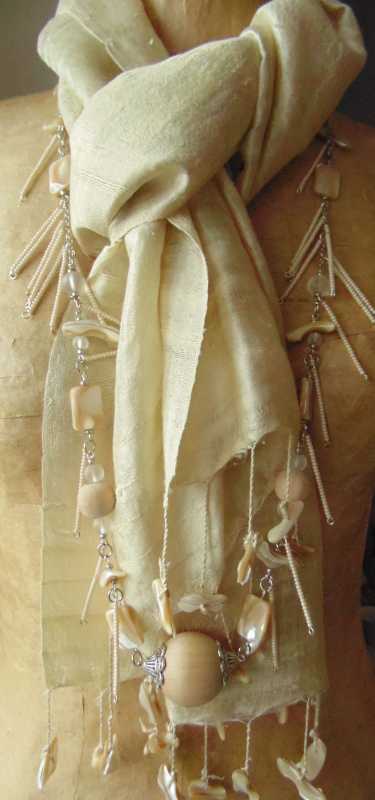 Шёлковый шарф с бахромой из перламутра+ ожерелье:дерево,стекло бисер и перламутр.