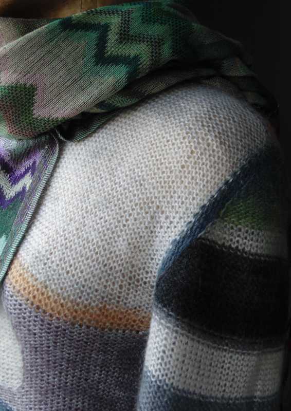 Головку рукава вяжу частичным вязанием- сверху вниз: одеваю петли проймы на иглы машины, потом вяжу три-четыре сглаживающих ряда, затем ,убираю петли в нерабочее положение. и только потом , включив рычаги частичного вязания, ввожу определённое кол-во петель в работу- справа и слева...