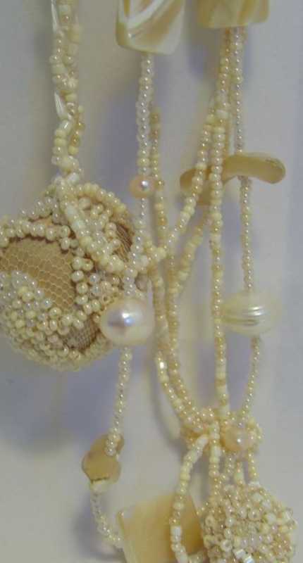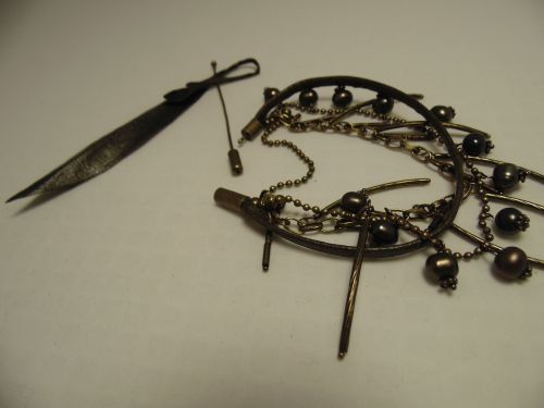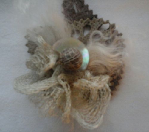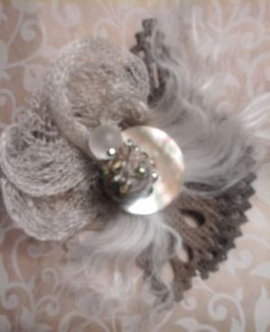 Брошка: варёная перфорированная кожа, перламутровая винтажная пуговица,вязаный из серебра бант и стеклянные биконусы....