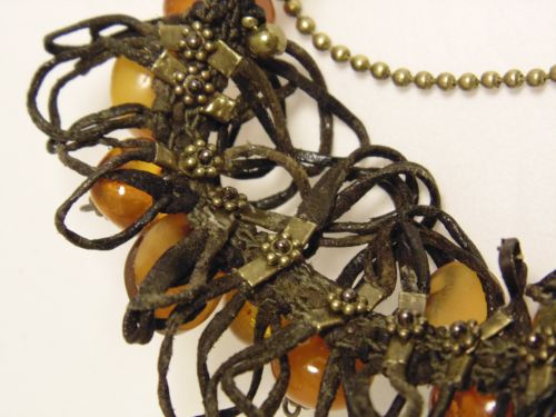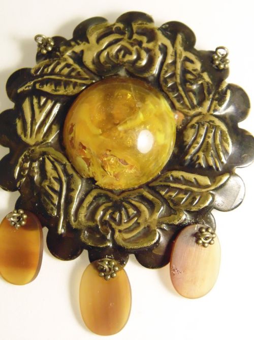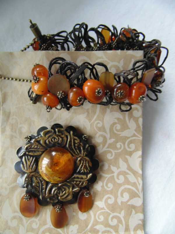 Браслет из вязаной кожи и янтаря+брошка из винтажной подвески