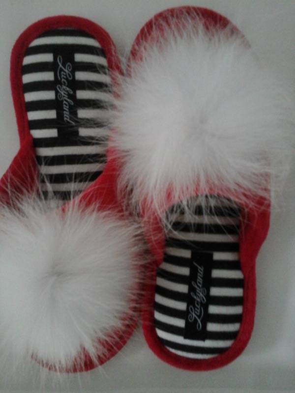 Связала помпоны из меха лисы, украсив ими домашние тапочки- подарок сестре на ДР.