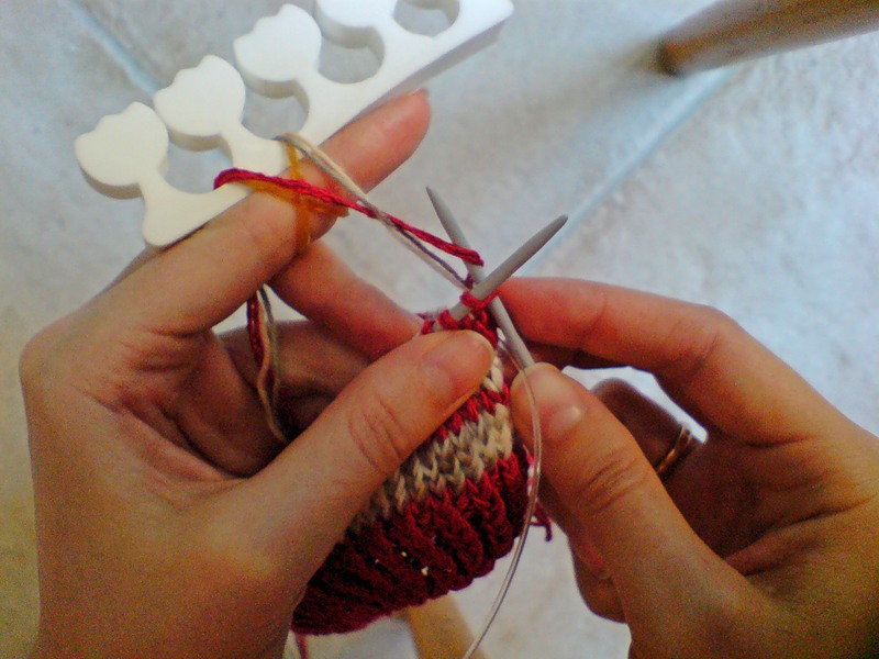 9-й круг: *2 лиц. вместе, 1 лиц., 1 изн.; повторять от * до 4-х последних петель, 2 лиц. вместе, 1 лиц., переместить маркер для нового начала круга = 108 п.