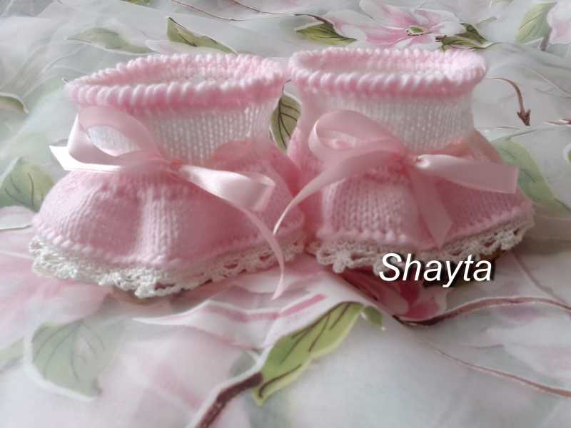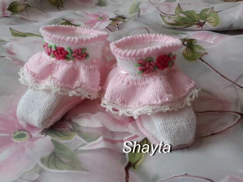 Затем обвязываем рюши:1р-ст б н, 2 ряд – арочка из 5 возд. п. через 2 петли, с “пико”-чередуем. Вышиваем розочки, протягиваем ленту. Пинетки готовы!