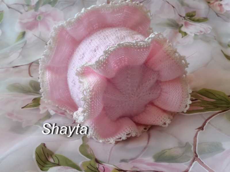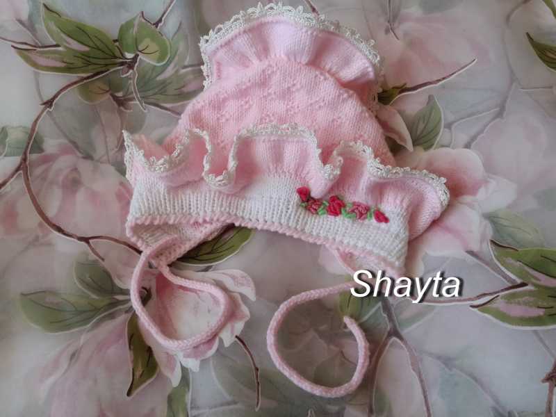 Пряжа:хлопок с шёлком и акрилом, спицы круговые № 2, крючок №1,7;для вышивки -хлопок 100%. Итак:Набираем 50 п и вяжем полой резинкой - 2 см: 1р:лиц, нак,...(на спицах 98п). 2р:Где был накид-вяжем лиц., след переснимаем-нитка перед работой,... и т д. Все остальные ряды повторяем(лиц. п.-лицевой, следующую -переснимаем-нить перед работой). Далее вяжем 6 рядов гладью, переходим на розовую нить(вяжем рюши): 3 ряда -гладью, затем-петли удваиваем, ещё вяжем 9 рядов, петли закрыть. От начала(границы) рюши набираем розовой нитью петли и вяжем узором по схеме( 10 см), далее - рюши, аналогичным способом. Снова набираем от начала(границы) рюши петли и вяжем донышко, сомкнуть в круг:7 лиц,2 вместе лиц, повторять до конца ряда. И так в каждом ряду делать убавления через 6 петель, через 5 петель..., пока не останется 6 петель, стянуть нитью. Рюши обвязать крючком:двумя рядами ст без нак, след. ряд:5 возд п, пико, чередуем через 2 петли. Завязки-вяжем полым шнуром, вышиваем, Чепчик готов!.