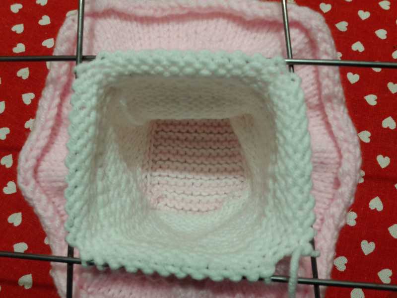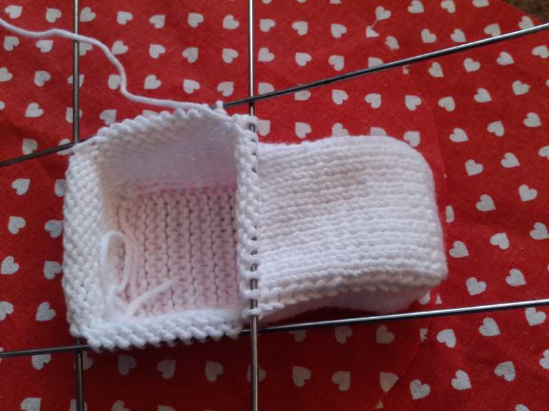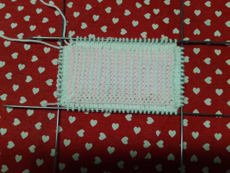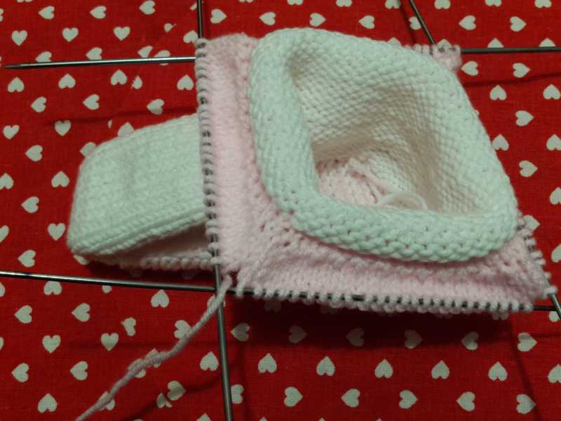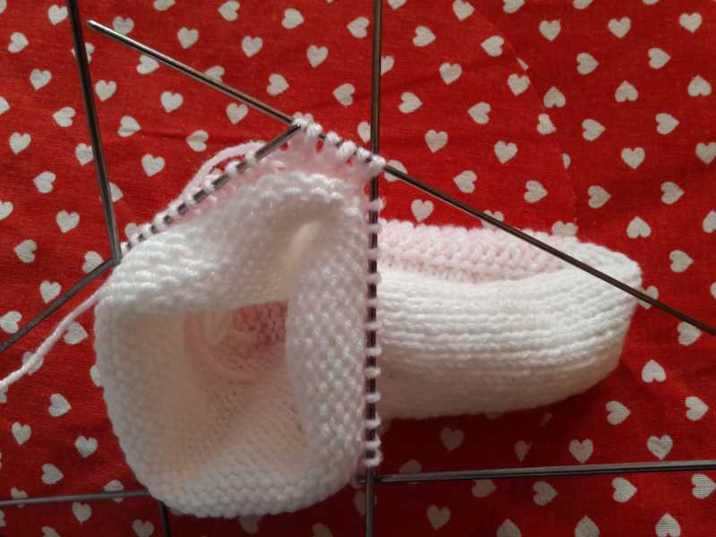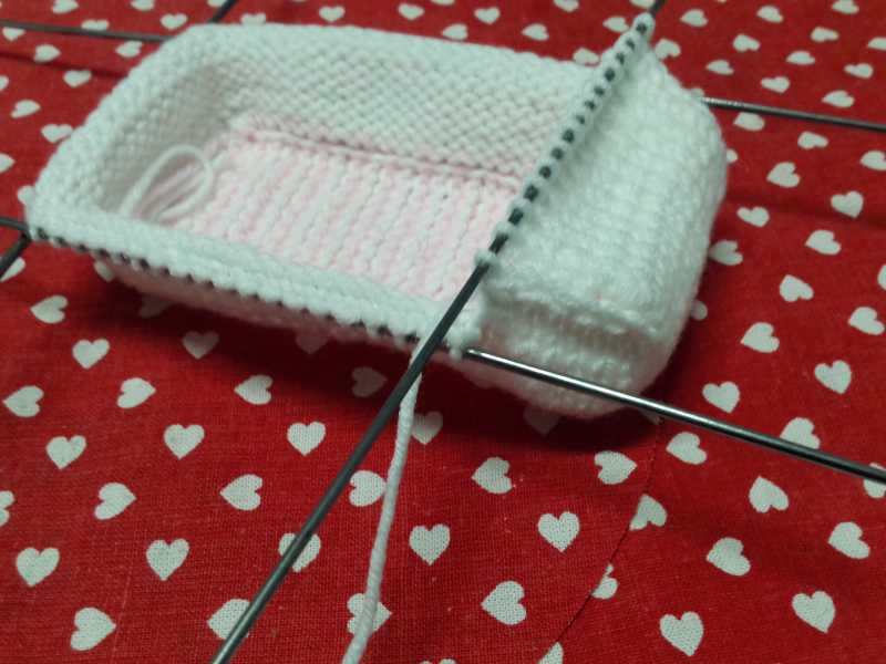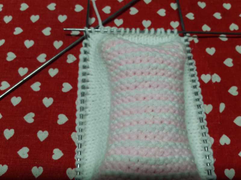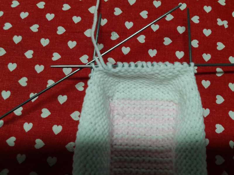 Белой пряжей набираем 14 петель и вяжем 2 р. платочной вязкой, затем меняем на розовую и снова 2р плат. вязкой – так продолжаем, пока длина подошвы не составит 11см. Далее переходим на 4 спицы и набираем петли по периметру подошвы со сторонами 14п и 25п. и вяжем 9р вкруговую.