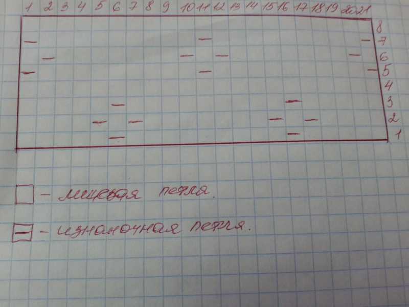 Теперь расклад петель такой: со сторонами в 11п. и 14п., делаем так, чтобы на всех спицах было по 12п. :