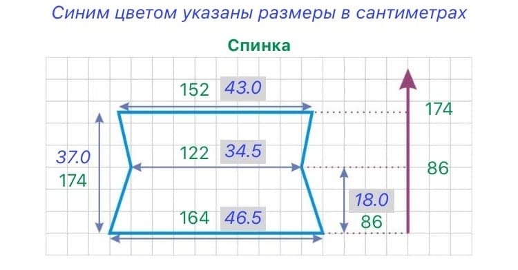 Все числа синим цветом - это размеры в сантиметрах, зеленым - это петли и ряды.