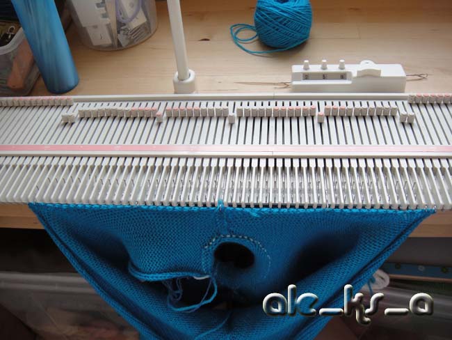 Сделав плечевые швы, навешиваем полотно на иглы для обработка проймы (здесь:двойной рулик).