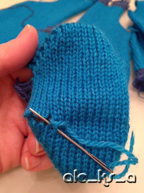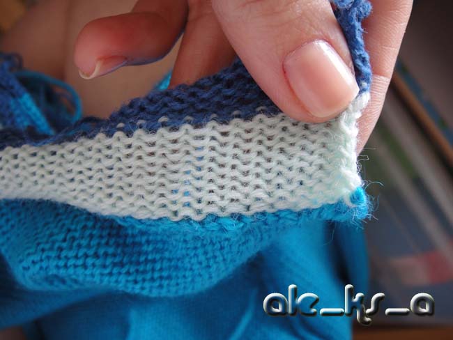 Снова снимаем на брос. После отпаривания закрываем петли иглой. Пройма готова. Со второй поступаем также.