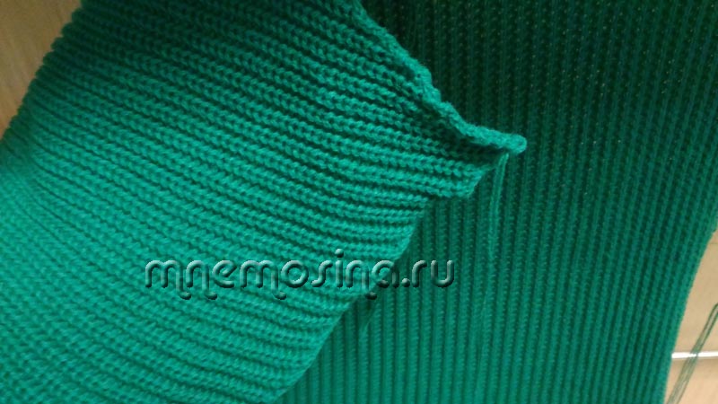 Растягиваем горловину на игольнице, помечаем крайние иглы. Вяжем 4см резинкой 1х1 бейку. Петли оставляем открытыми (заканчиваем бросовой нитью)