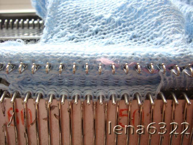 Иглы выдвигаем в переднее полурабочее положение или положение D, все петли сдвигаем за язычки игл и придвигаем к игольнице. Закрываем язычки игл. На каждой игле по 3 петли.