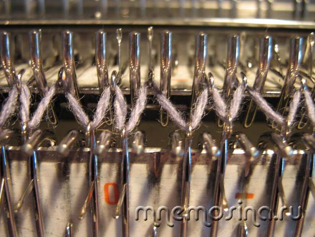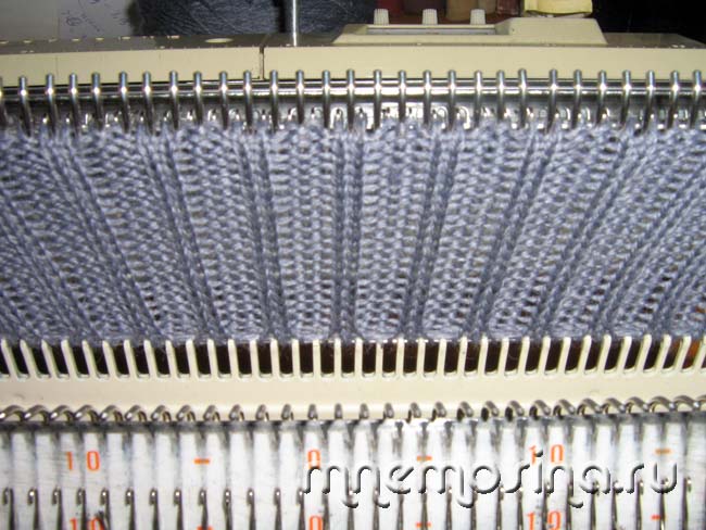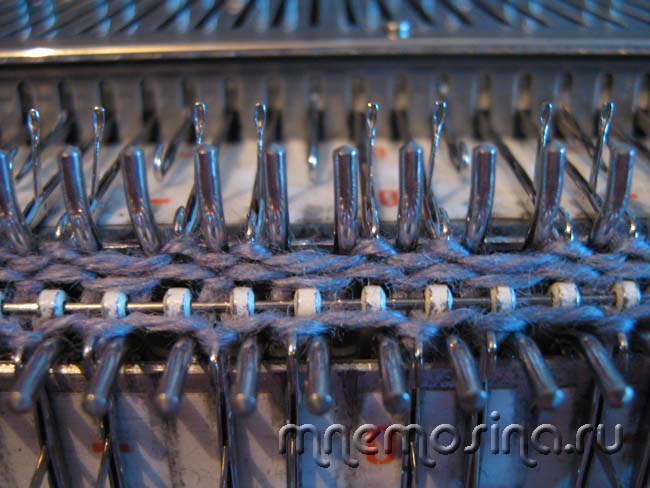 Каретки настраиваем так, чтобы они вязали в обе стороны. Вяжем резинку 2х2.