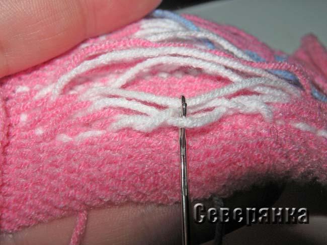 Провязываем вручную, нить должна лежать под язычками, нить фона на язычках.