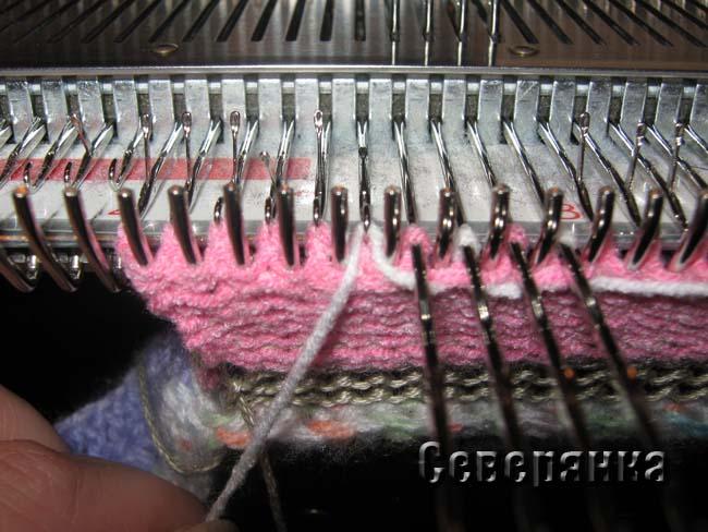 Провязываем один ряд. Провязались все иглы кроме ПНП. Берем нить для узора, прокладываем ее на иглы ПНП, аккуратно задвигаем иглы, чтобы нитка оказалась под язычком. Вручную провязываем эти петли.